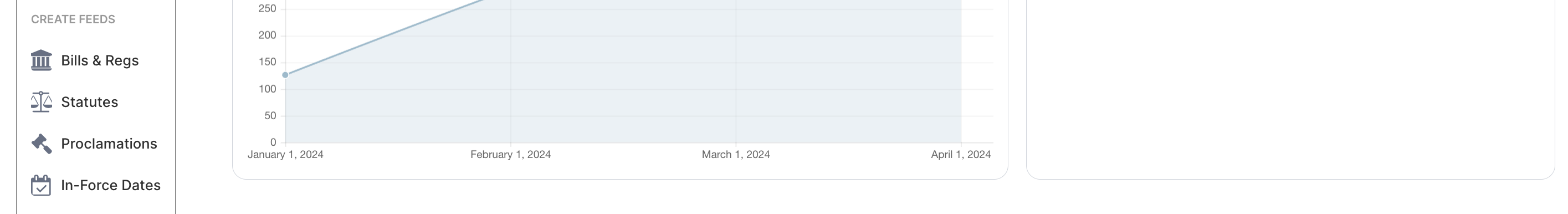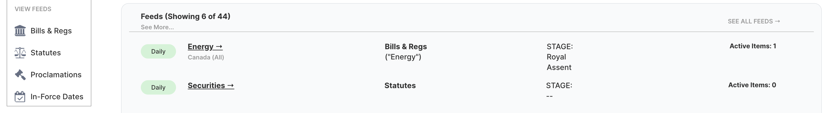 If you're interested in keeping up with a specific keyword, you can access the keyword feed creator by accessing the "Create Feeds" heading through the Dashboard, then clicking Bills & Regs.