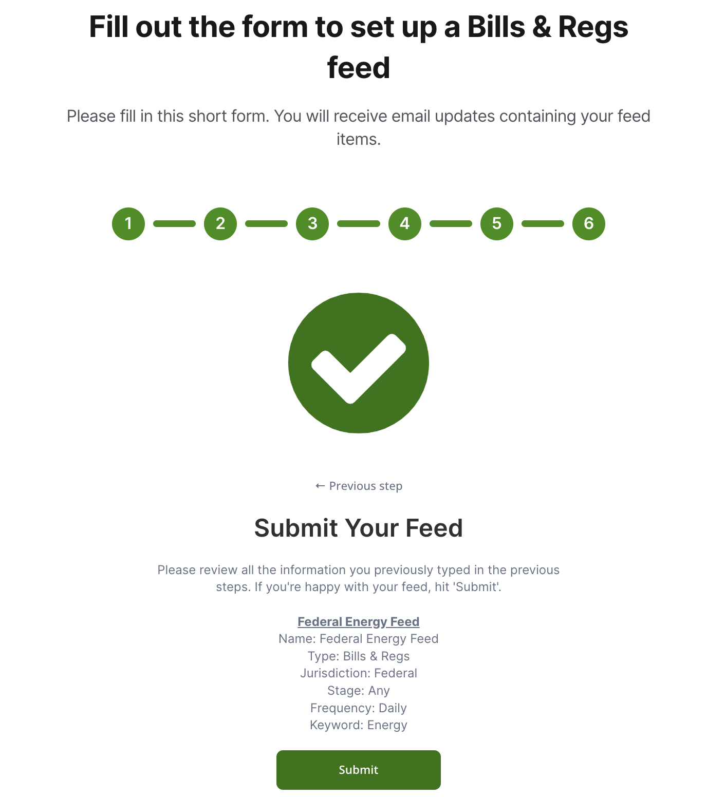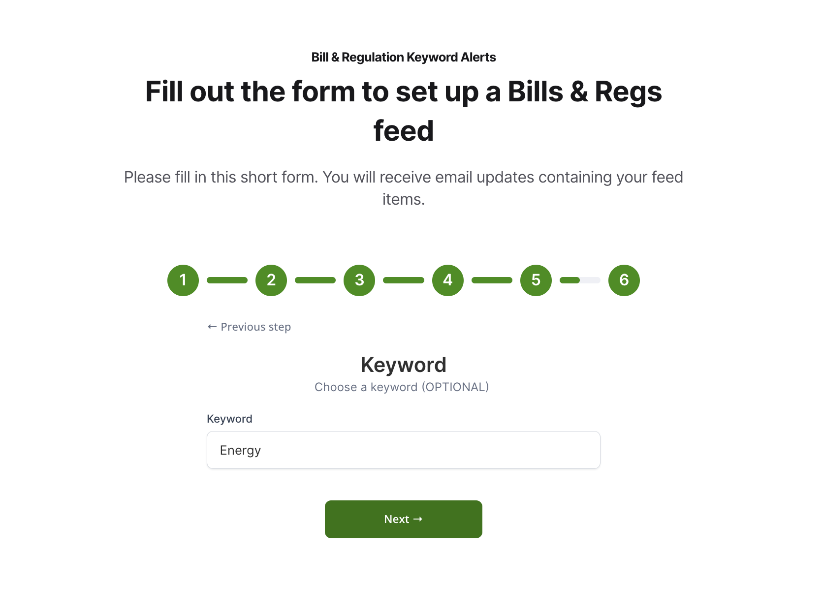 This will take you to the Bills & Regs Feed creator. From here, simply fill out a form, and you'll have a functioning keyword feed seconds